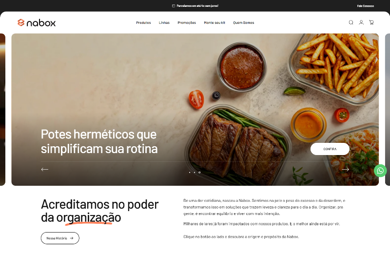 Nabox is a Brazilian e-commerce brand that sells glass food storage containers with hermetic (airtight) lids. They focus on kitchen organization and meal prep solutions, offering various sizes of square, round, and rectangular glass containers that are freezer, microwave, and oven-safe (up to 300°C). The brand emphasizes BPA-free, non-toxic materials with removable silicone seals. They target customers looking to organize their kitchens, prepare weekly meals, and maintain a healthier lifestyle with better food storage.